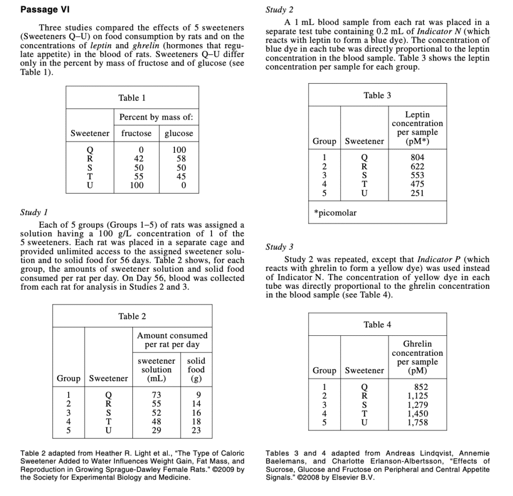 These tasks will test your knowledge of experimental tools and processes and how well you are able to predict outcomes if test conditions are changed. Again, for these science questions, you want to pay attention to the details mentioned in the passage. Your ability to comprehend given information will go a long way when answering the question. Some students who have spent a lot of time doing scientific reading might find these sections easier than others.