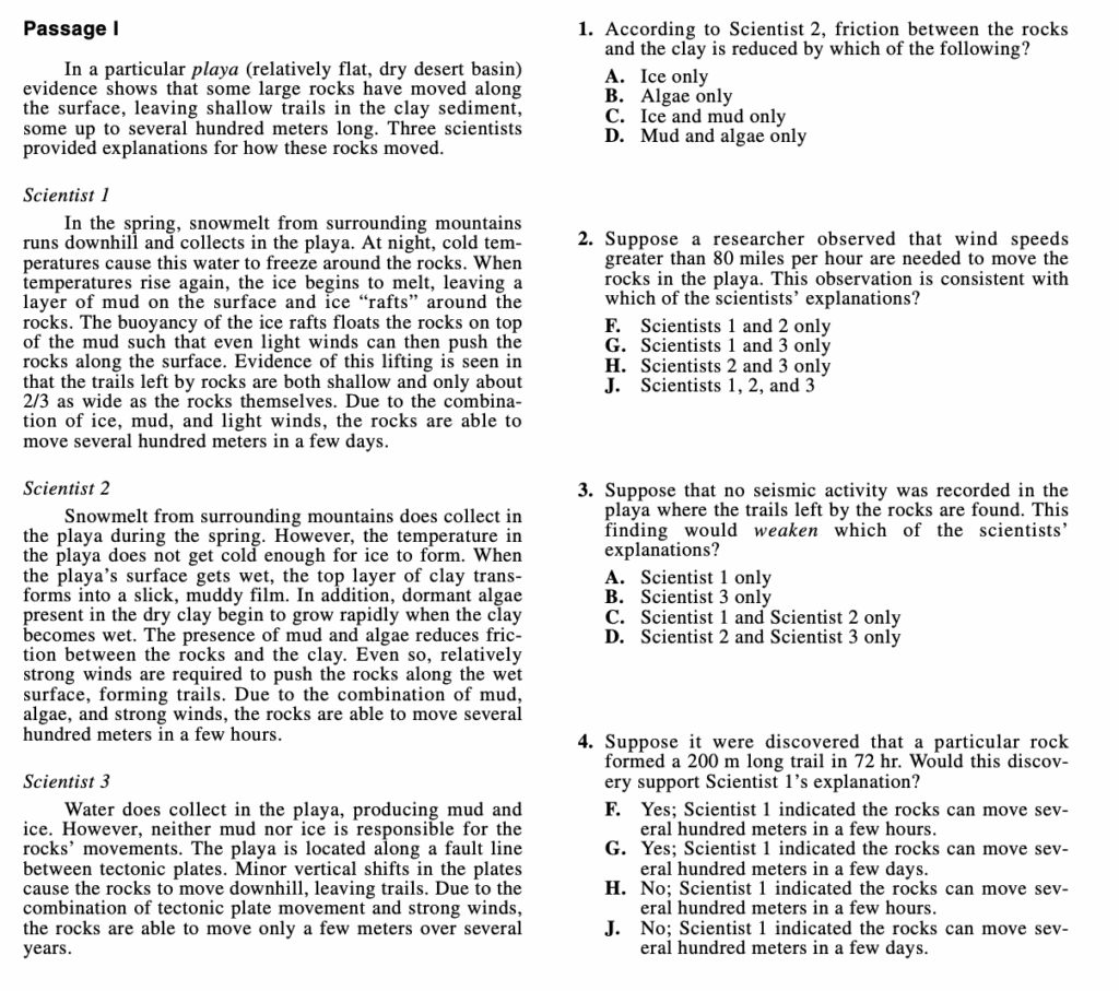 For example, the ACT science questions in this section might require you to look at two or more conflicting viewpoints passages on a phenomenon and identify the inconsistencies. You need to be able to understand each point of view and notice any subtle differences or similarities in those perspectives. A good tip is to circle or underline the main idea as you read so it’s easy to find it when you are answering the questions. Here is an example of what the questions might look like.