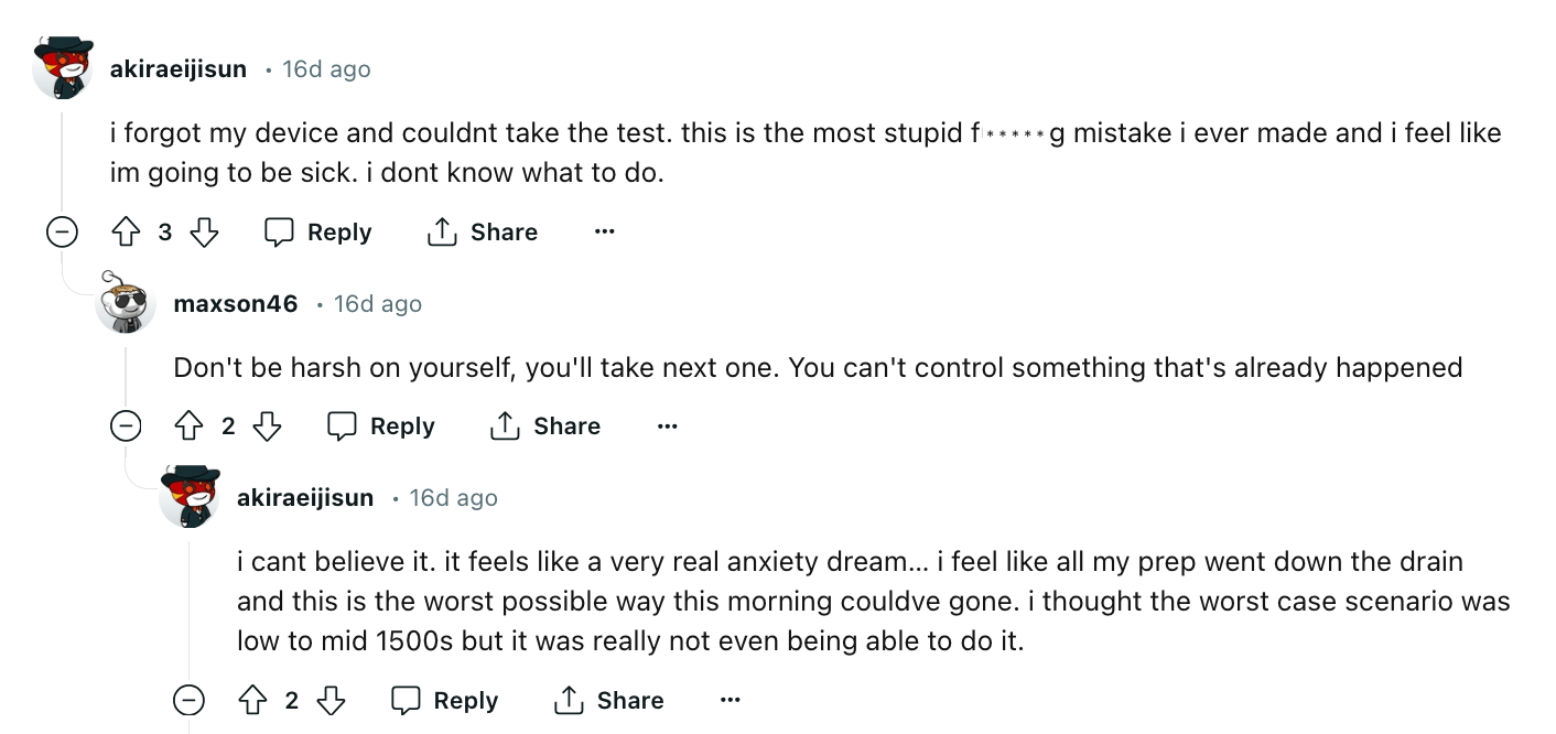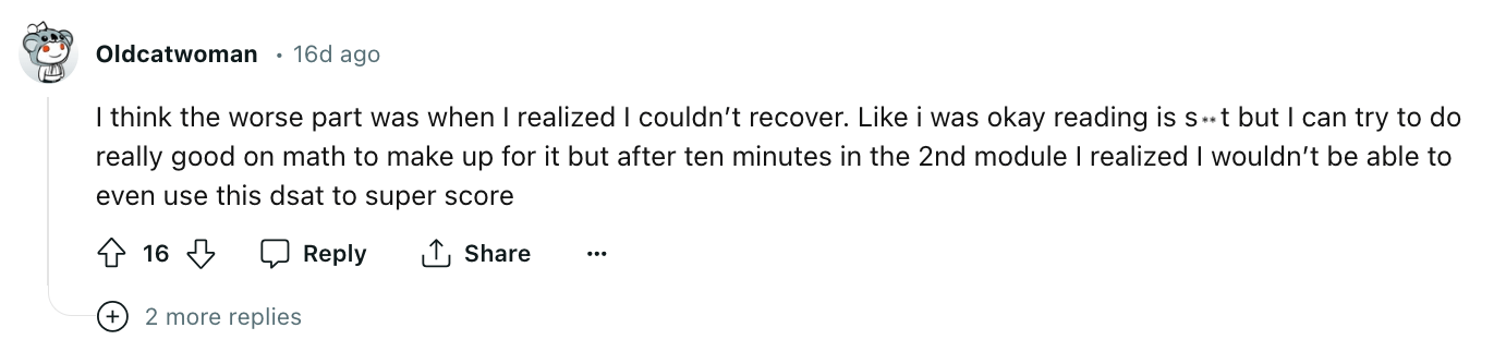 Realizing that there’s no way to bounce back during the test can be really tough. One student shared how they initially thought they could compensate for a weak Reading section with a strong Math performance, only to realize early into the second Module that it wouldn’t be possible.